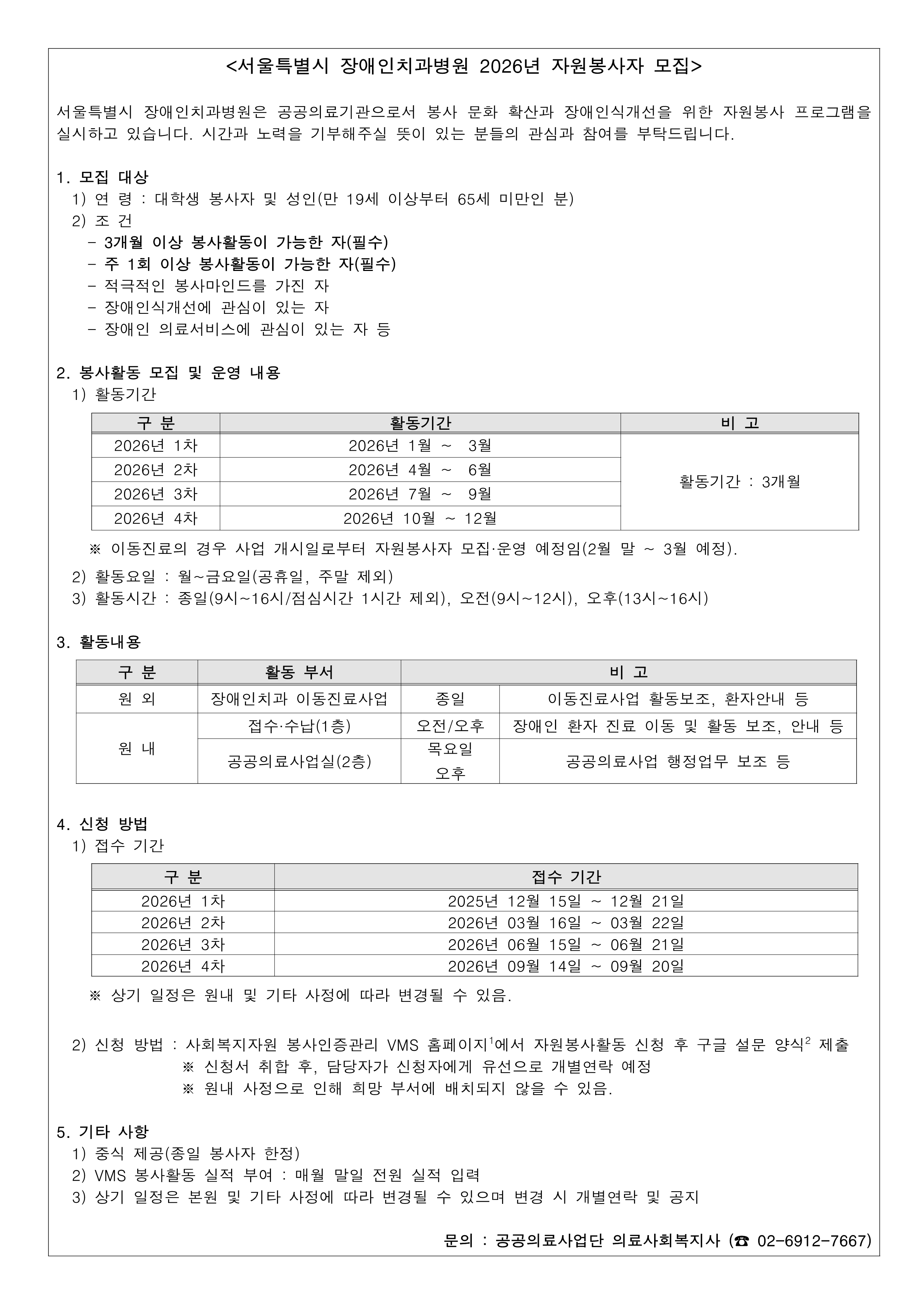 서울특별시 장애인치과병원 2026년 자원봉사자 모집