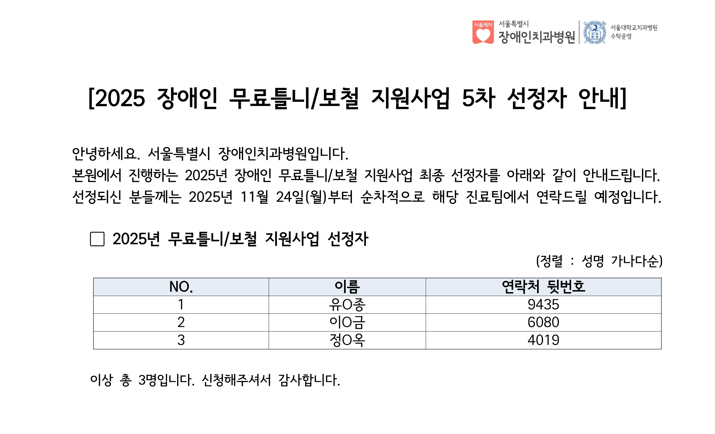 서울특별시장애인치과병원의 진료시간표를 확인할수 있습니다